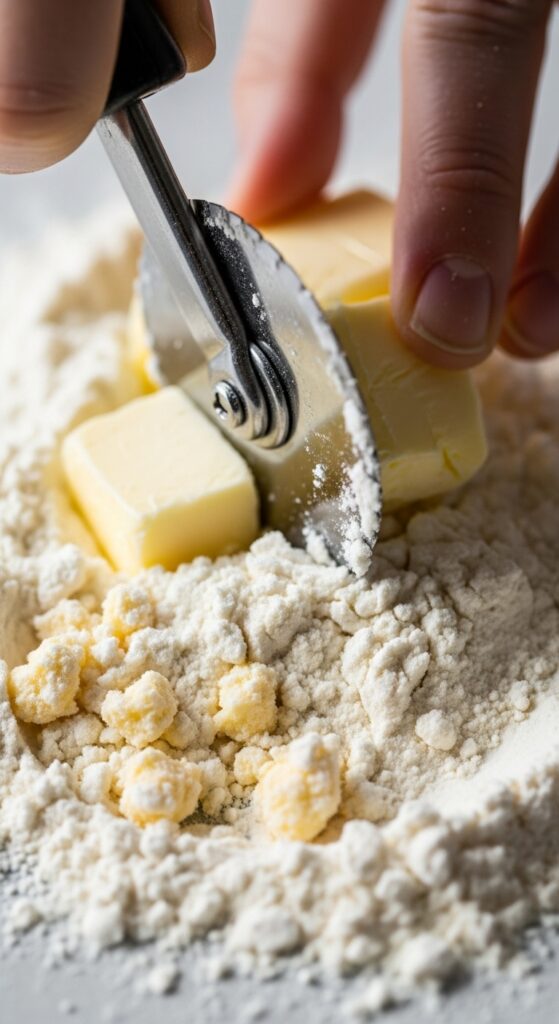 - Cut in the Fat. Add your ice-cold, cubed butter to the flour mixture. Using your fingertips, a pastry cutter, or two forks, work the butter into the flour until it resembles a coarse crumb with some pea-sized bits of butter remaining. Those butter bits are your future flaky layers. Protect them.