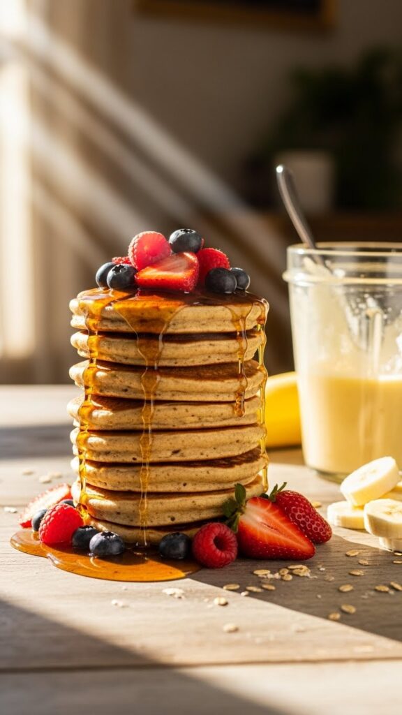 Short Hook / Why It’s Awesome → No eggs, no dairy, no weird flours. Just whiz everything in a blender and pour. Fluffy pancakes in minutes.