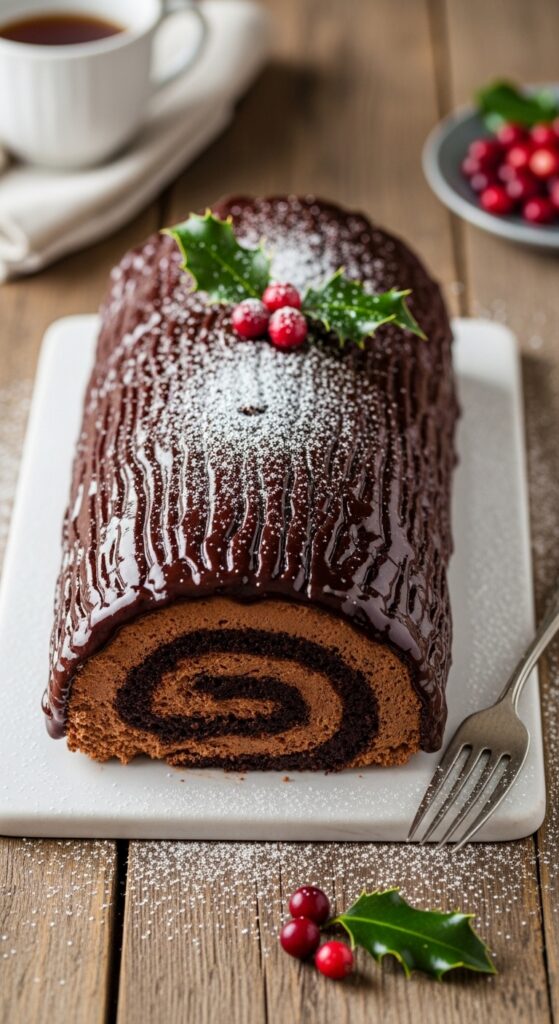 - Frost: Cover the log with the chocolate ganache. Use a fork to create “bark” textures. Dust with powdered sugar for “snow.”
