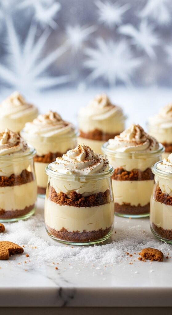 All the flavor of eggnog in a creamy, no-bake cheesecake form. Layered in individual jars, they’re portable, adorable, and require zero oven space—a true holiday miracle.