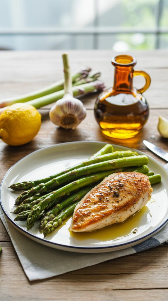 • Ingredients: Chicken breasts, asparagus, lemon, garlic, olive oil.