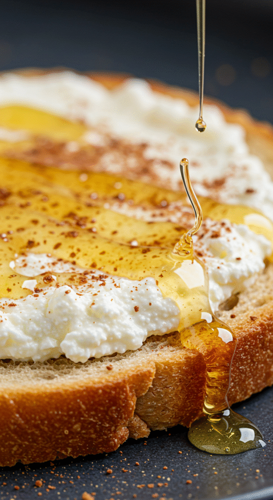 • Method: Toast your bread. While it’s hot, spread a thick layer of ricotta on top. Drizzle with honey and a heavy dusting of cinnamon. It’s like cheesecake, but you can eat it for a snack without the guilt :).