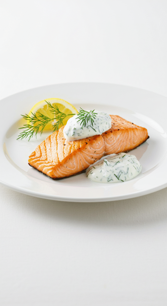 • Ingredients: Salmon fillets, fresh dill, lemon, Greek yogurt, garlic.