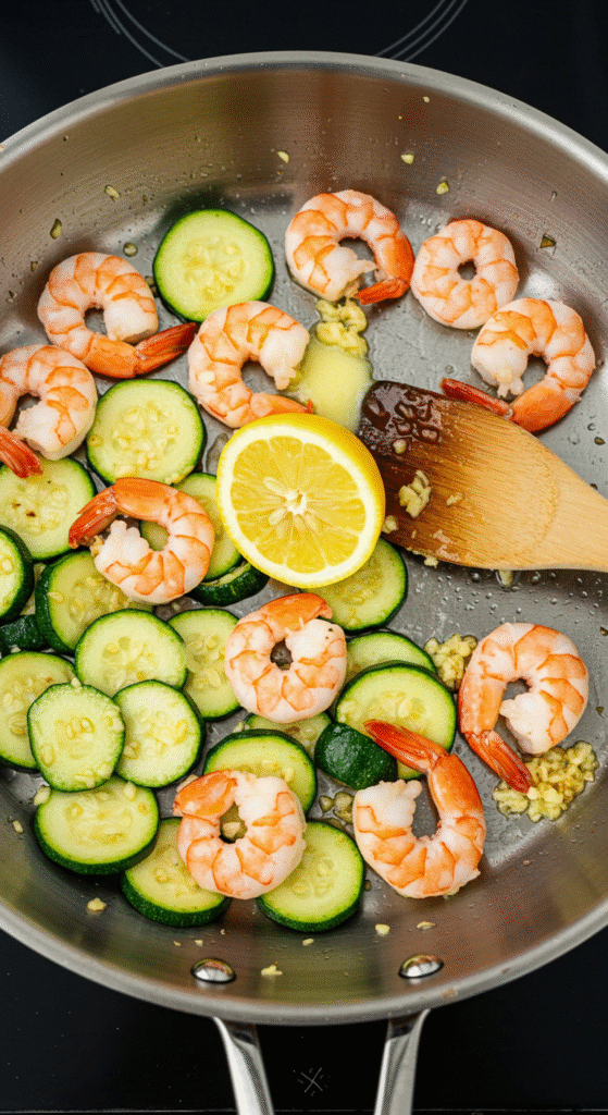 • Method: Sauté sliced zucchini in a hot pan with butter and garlic until it has some color. Remove it, then toss in the shrimp. Cook until they’re pink and opaque. Add the zucchini back, squeeze a lemon over it all, and give it a toss. Done.