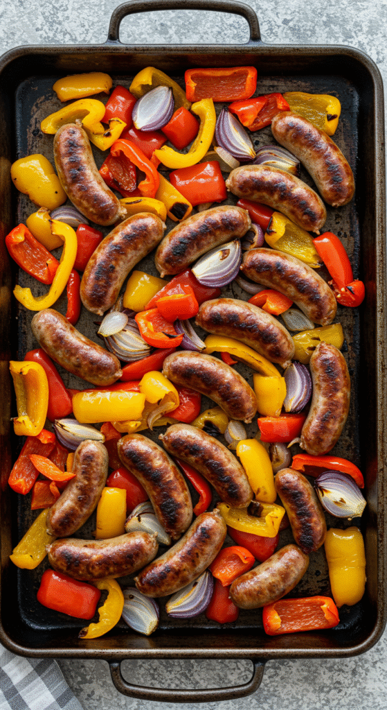 • Method: Chop the peppers and onion into chunks. Toss everything on a sheet pan with the whole sausages, a good glug of oil, and the seasoning. Roast at 400°F until the sausages are cooked and the veggies are tender and slightly charred. So easy.