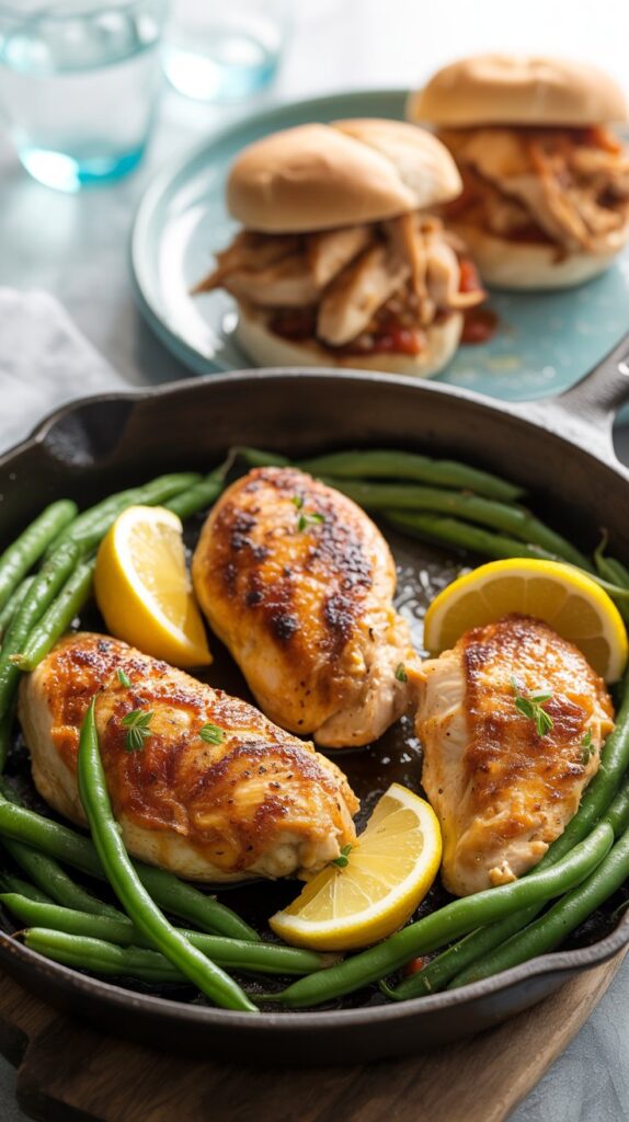 - Ingredients: Chicken breasts, fresh green beans, butter, lemon, lemon pepper seasoning.