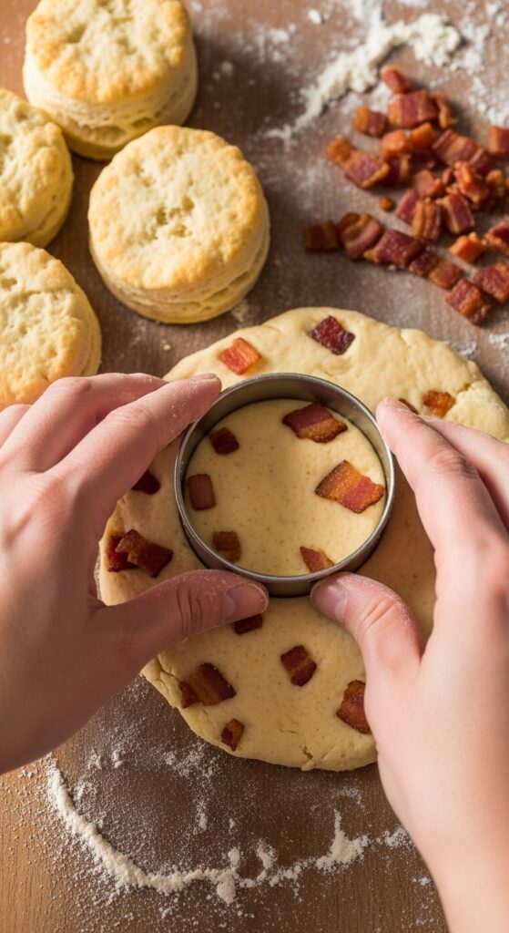 - Bake to Perfection. Place the biscuits on your prepared baking sheet. Sprinkle the remaining bacon on top for a gorgeous, savory finish. Bake for 10-12 minutes, until they are beautifully golden brown and your kitchen smells like heaven.