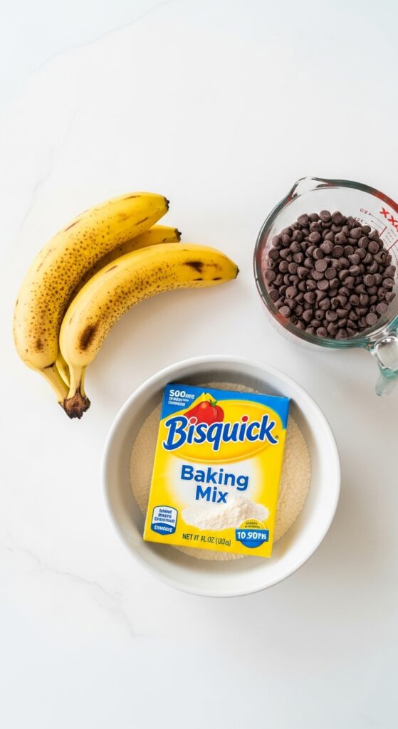 - Mix Everything. Add the Bisquick and chocolate chips to the mashed bananas. Stir until just combined. A few dry streaks are fine! Do NOT overmix.
