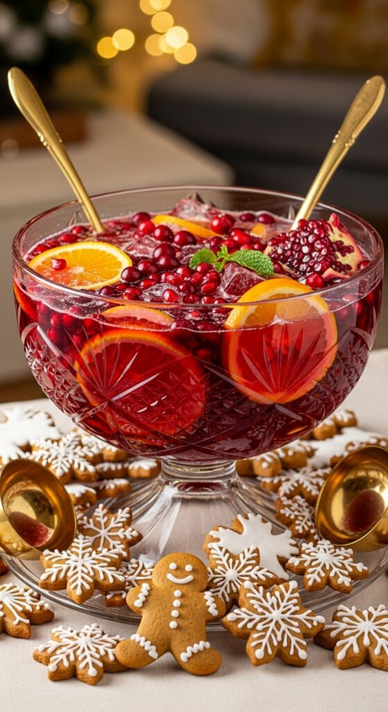- Assemble at Party Time: Just before guests arrive, pour the juice mixture into a punch bowl. Add the orange slices, cranberries, and pomegranate arils.
