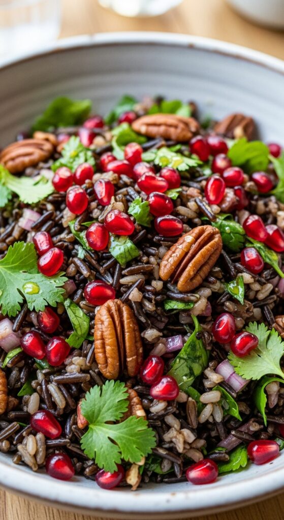 - Combine Salad: In a large bowl, mix the cooled wild rice, pomegranate arils, pecans, parsley, and mint.