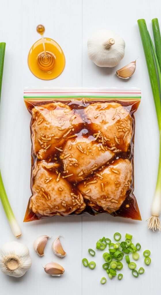 2. Add all the ingredients—soy sauce, honey, ketchup, garlic, ginger, and rice vinegar—to the bag.