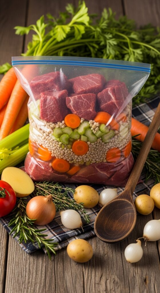 1. Combine the cubed beef, rinsed barley, carrots, celery, and onion in your freezer bag.