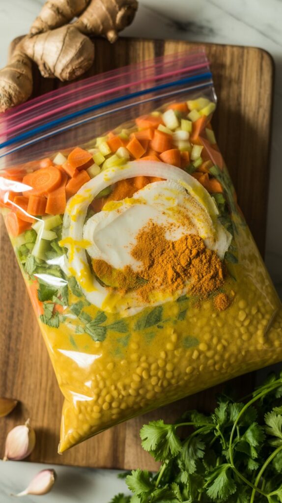 1. Dump the rinsed lentils, chopped onion, and carrots into the bag.