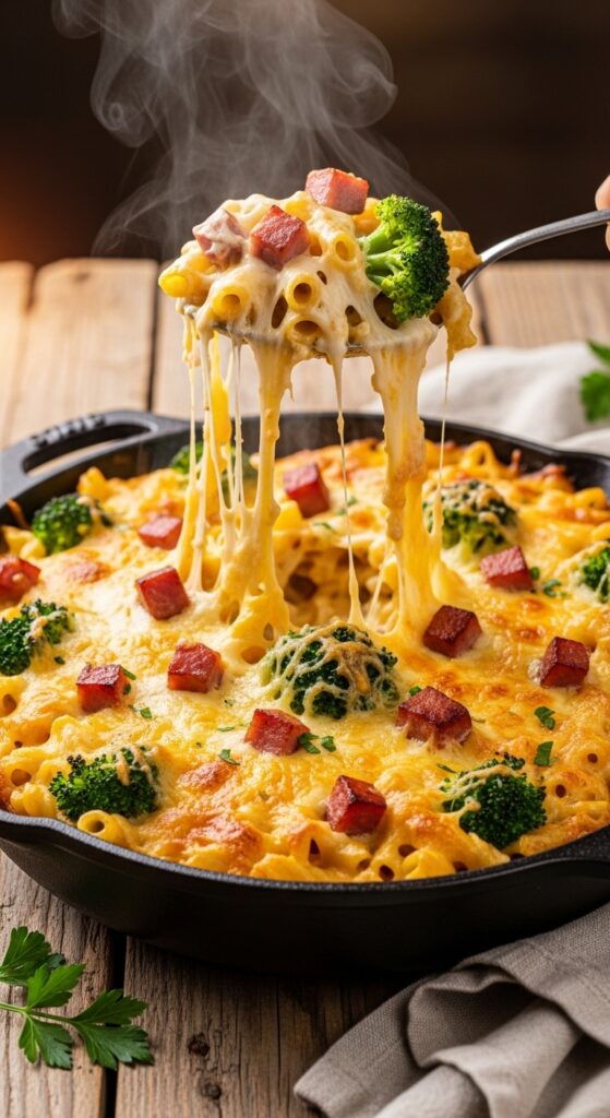 - Combine Everything: To the cheese sauce, add the cooked pasta, diced ham, and broccoli. Stir until everything is coated.