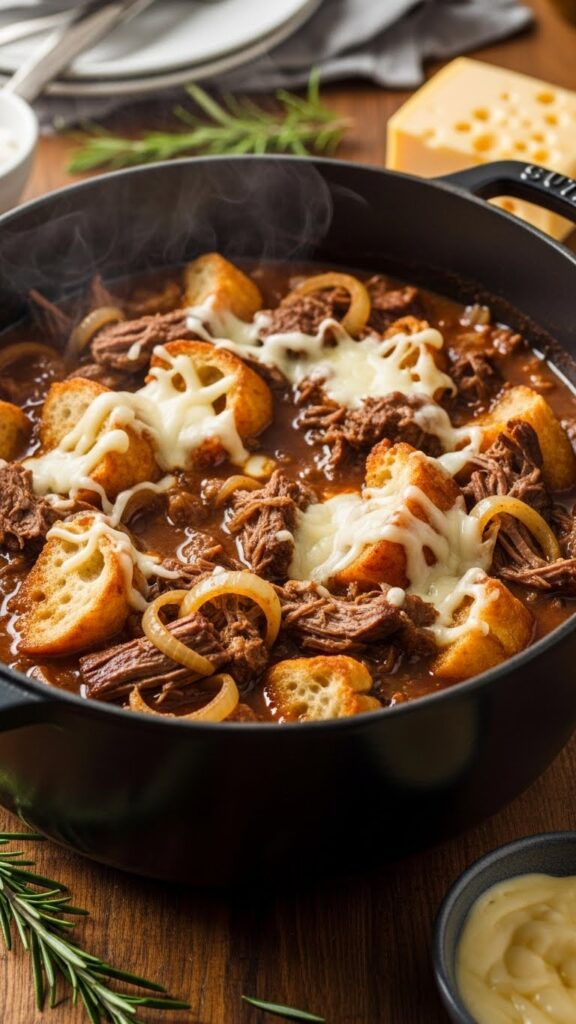 Short Hook / Why It’s Awesome → Beef, broth, seasoning packet. That’s the whole list. It tastes like a fancy French dip sandwich in cozy stew form.