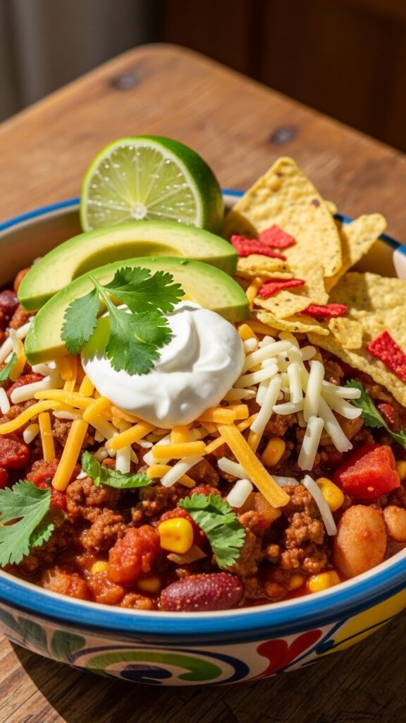 - Toppings: Shredded cheese, sour cream, cilantro, avocado, crushed tortilla chips.