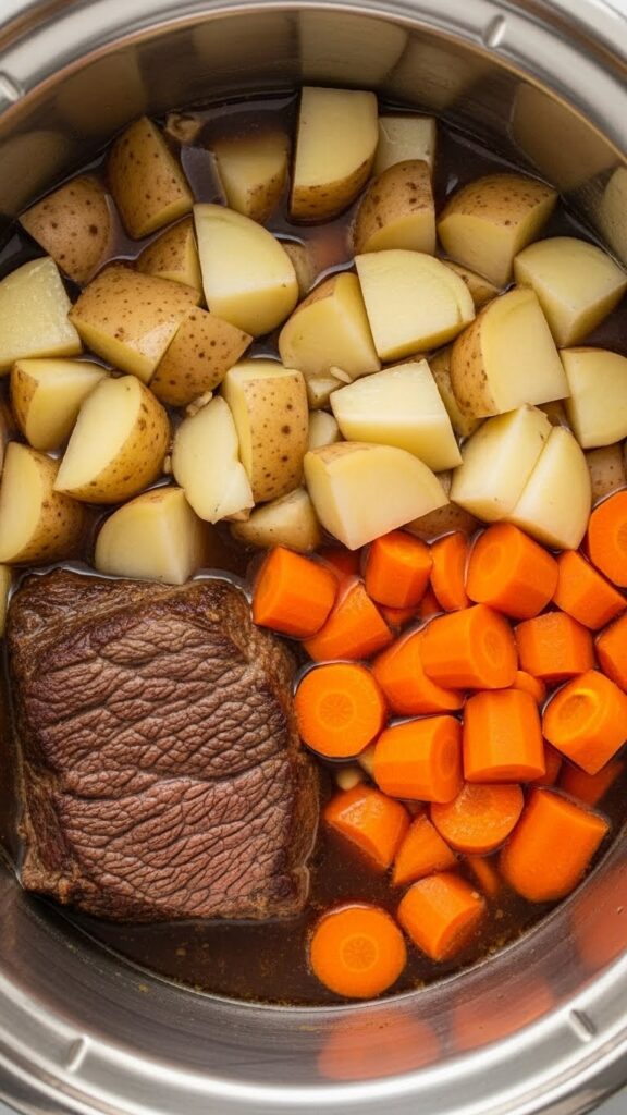 3. Layer Smartly: Pour this onion mixture over beef in crock pot. Add broth and Worcestershire. Place the potato and carrot chunks on top, submerging them in liquid but not stirring. This gentle placement helps them cook evenly without breaking down.