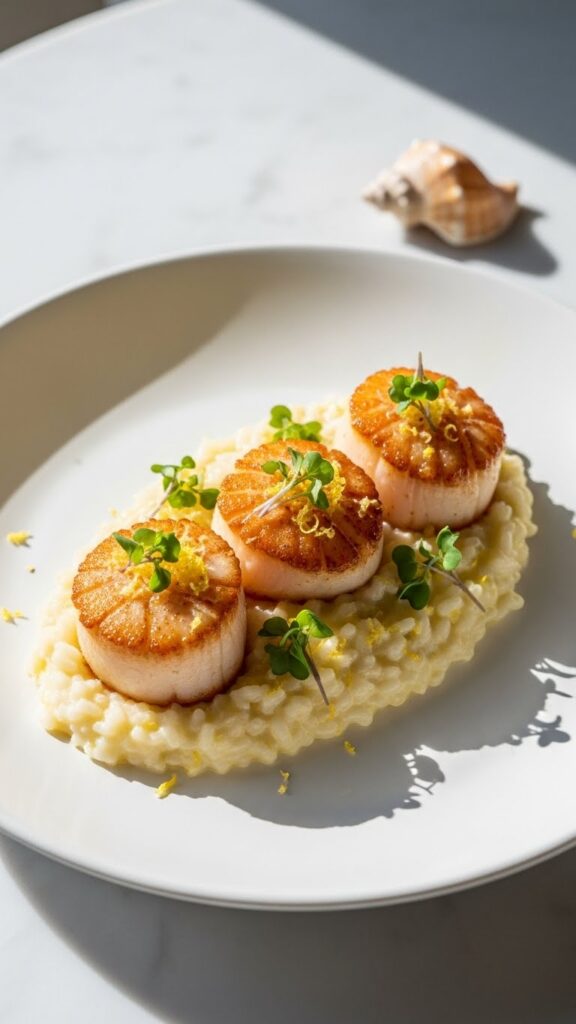 2. The “Coastal Escape”: Lemon Butter Scallops with Risotto
