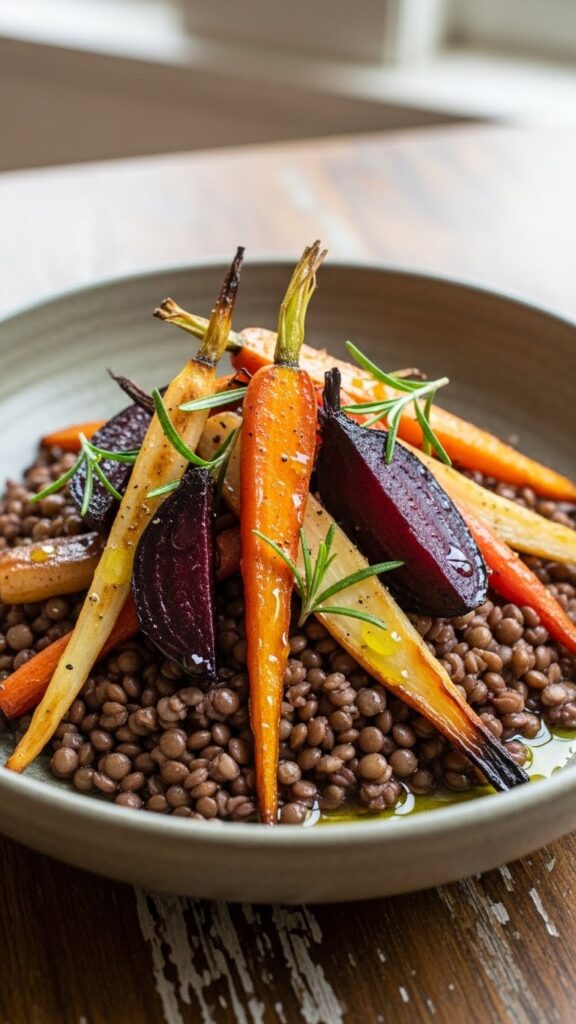 4. The “Vegan Stunner”: Red Wine Braised Lentils with Roasted Roots