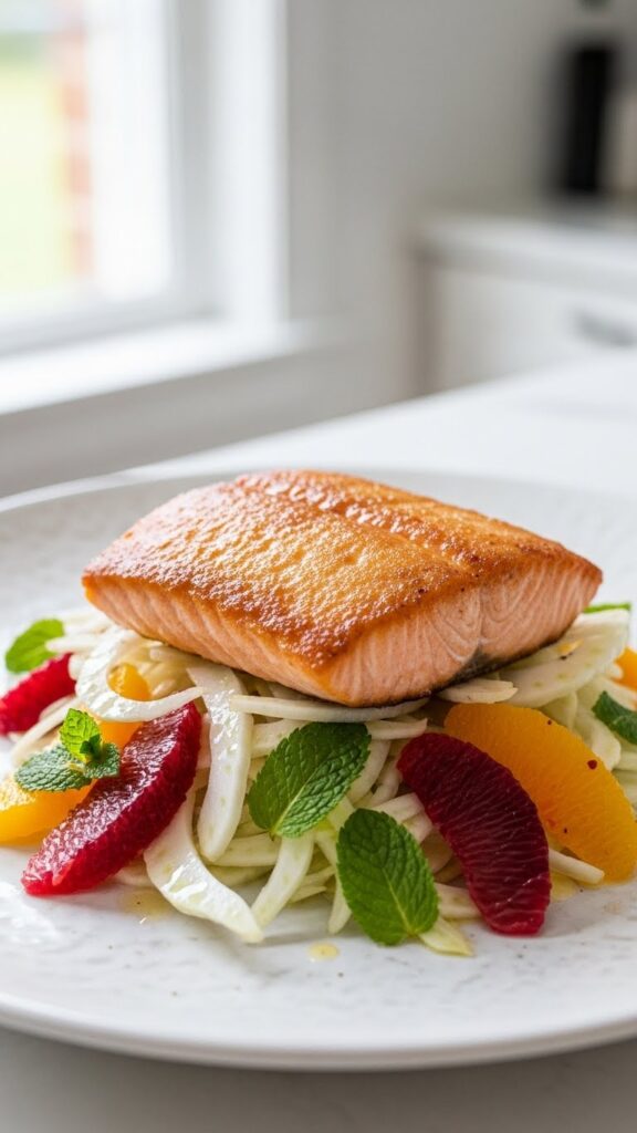 5. The “Effortlessly Chic”: Seared Salmon with Blood Orange & Fennel Salad