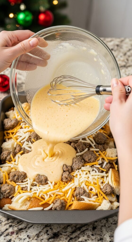 4. The Pour and Press. Slowly and carefully pour the egg mixture over everything in the baking dish. Now, take a fork and gently press down on all the bread cubes, ensuring they get submerged and soak up that custardy goodness.