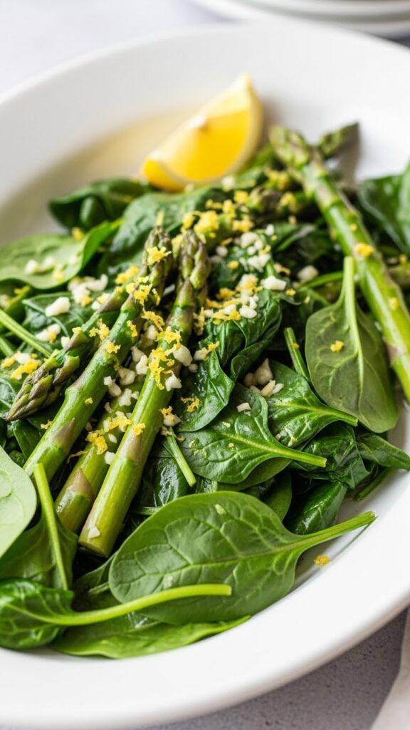 - 1 bunch of asparagus, trimmed, or 5 oz baby spinach