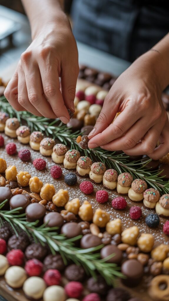 - Scattering: Take your smallest items (candied nuts, dried cranberries, tiny candies, and miniature marshmallows) and scatter them into the gaps, corners, and even over the edges of your clusters.