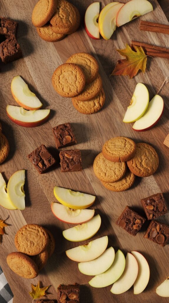 - Place a dark brown brownie pile next to bright red apple slices.