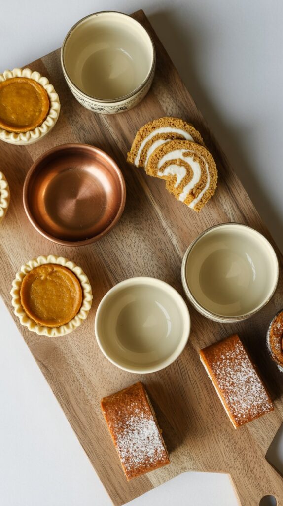 - Add Largest Items: Now, place your largest items (the mini pies and sliced pumpkin roll) next to the bowls. Let them touch the bowls; we want everything to look connected and overflowing.