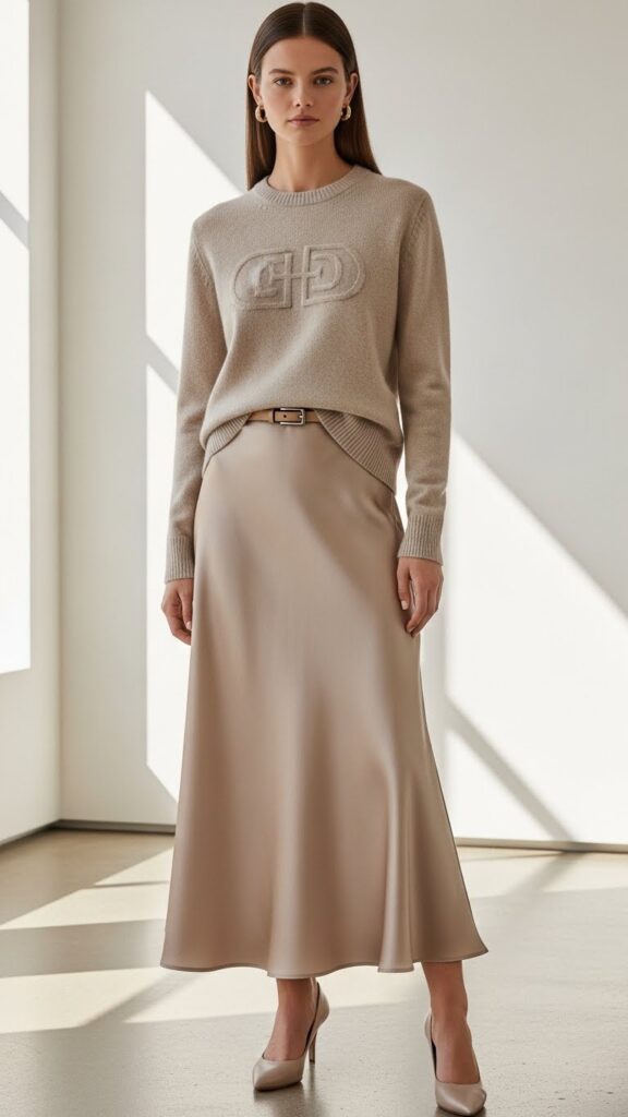 Tuck it into a fluid, midi-length silk skirt. The combo of cozy, status-y knit and effortless, luxurious silk is chef’s kiss. Cinch it with a thin, leather belt right at your natural waist. This is the perfect “creative director at a gallery opening” look. It’s comfortable, impossibly chic, and the logo element feels intentional, not loud.