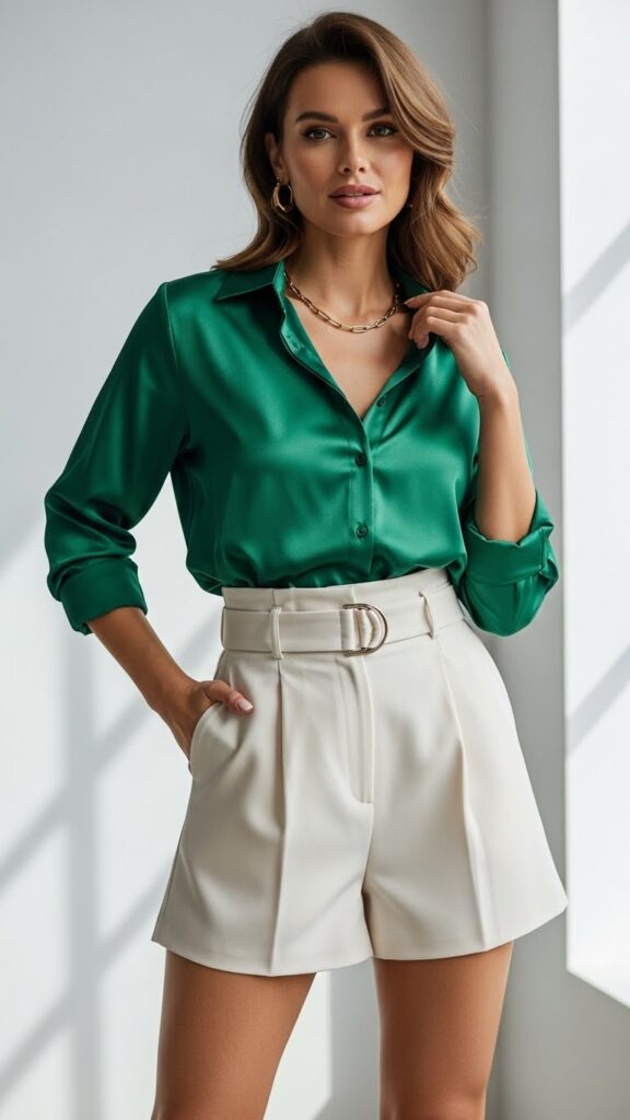 9. The Satin Shirt & High-Waist Tailored Shorts