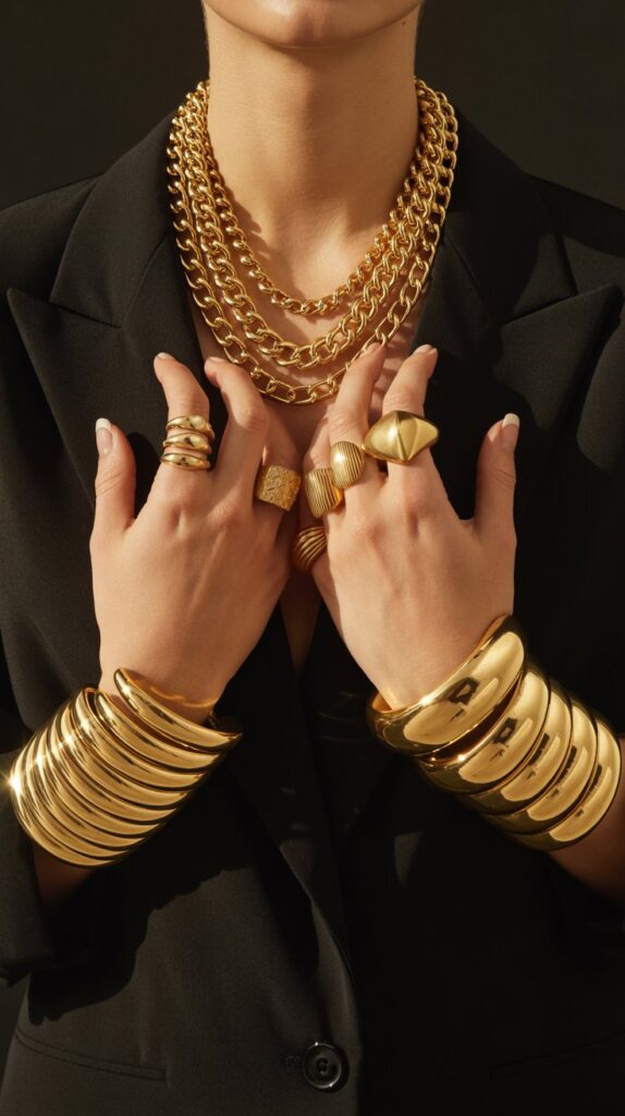 Your new uniform: multiple chunky gold chains layered at different lengths, stacked cuff bracelets (mix textural ones with smooth ones), and at least two statement rings per hand. Don’t match everything perfectly. The mix is what makes it look curated and personal, not like a jewelry store mannequin. This instantly elevates even the simplest black tee and jeans into a luxury fashion moment.