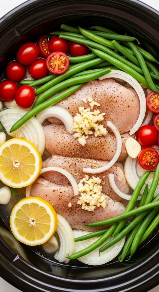 - Build the Flavor Base. Scatter the chopped onion and minced garlic on the bottom of your crockpot. Place the seasoned chicken on top of this aromatic bed.