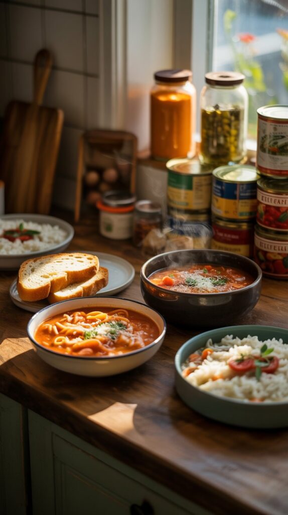 - Canned goods: Beans, tomatoes, or tuna can add protein and flavor.