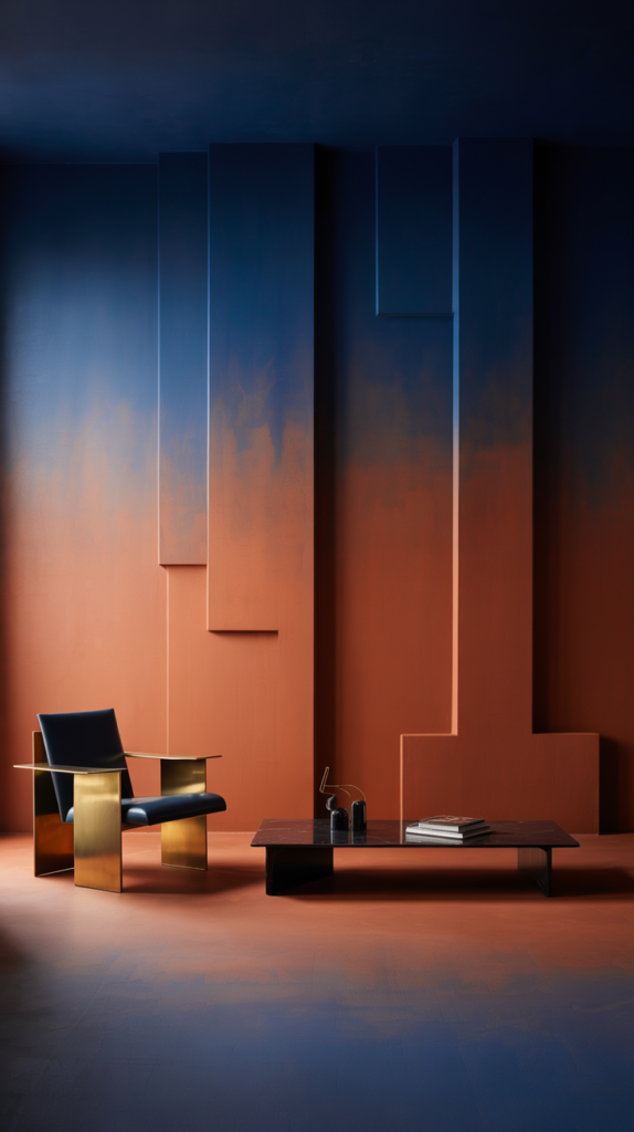 Forget accent walls in one flat color. The Neo Deco living room starts with a moody, atmospheric gradient. We’re talking a wall painted in a ombre fade from deep, midnight navy at the ceiling down to a warm terracotta or dusty rose at the base.