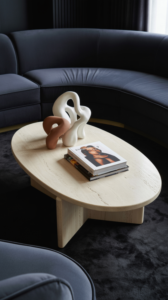 This is your organic, grounding element. A low, rectangular or oval coffee table in honed travertine (or a good lookalike) brings in natural texture and weight.