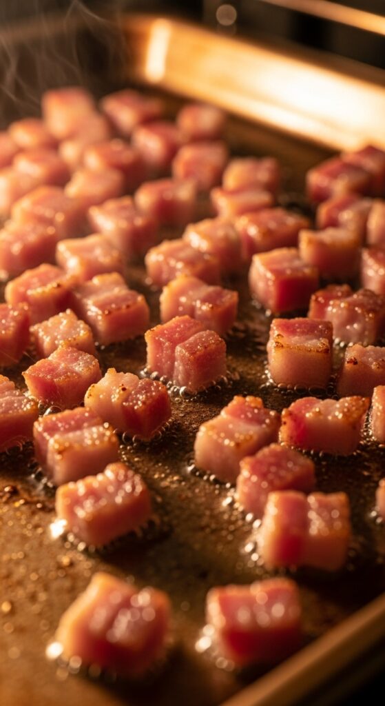 2. Render the Pancetta. Scatter the diced pancetta on a large, rimmed baking sheet and pop it in the oven for about 5 minutes. You just want to start rendering its fat. This creates a built-in, flavorful cooking oil.