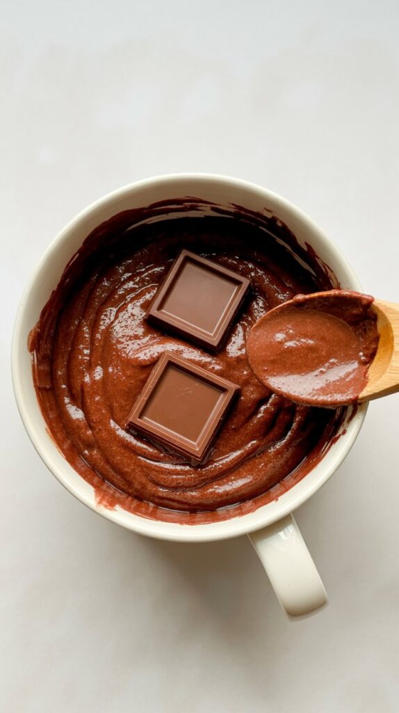 Divide half the batter between the two mugs. Place the chocolate squares or chips in the center of each. Top with the remaining batter, covering the chocolate completely. This creates an irresistible molten center.