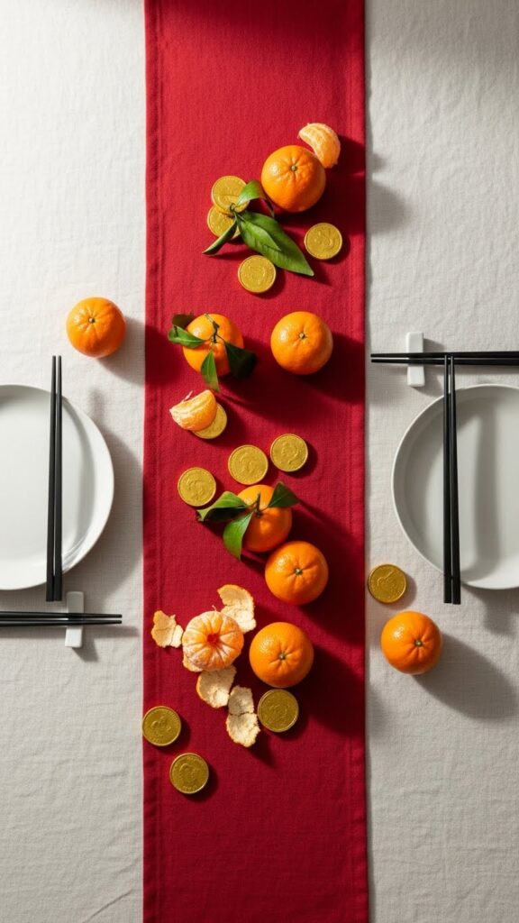 Sprinkle gold-foil-wrapped chocolate coins and clementines (symbolizing good luck and wealth) down the center. Use black chopsticks for everyone—they’re chic and symbolize grounding energy. This look is modern, meaningful, and clean-up is a breeze.