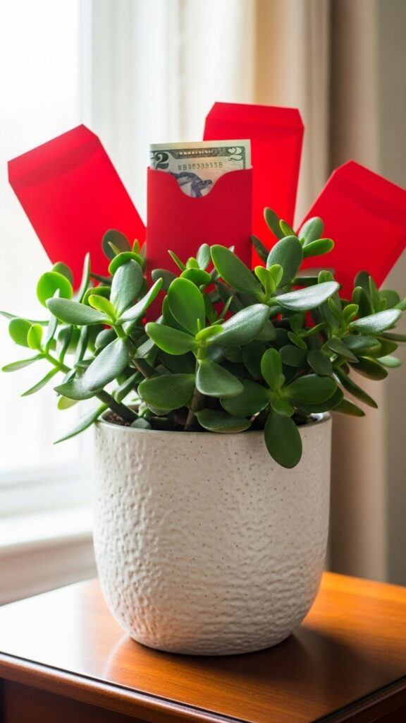 Instead of just handing out red envelopes, make them part of your decor. Take a healthy, lush plant like a jade plant (money plant!) or any green houseplant. Gently tuck red envelopes with lucky amounts ($2, $8) among its leaves.
