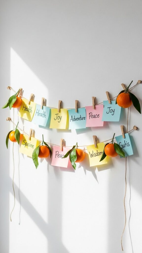 Create an interactive art installation. String up a simple piece of twine or ribbon. Use mini clothespins to hang fortune cookie-style messages (write your own wishes for the new year) and small mandarin oranges.