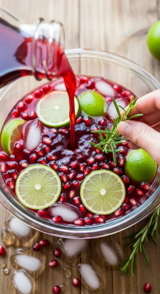 - Build the Base. Pour the cold pomegranate juice into the punch bowl. Add most of your pomegranate arils and lime slices, saving a few for a fancy garnish on top.
