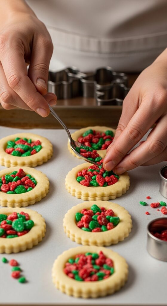 - Fill the Windows. Carefully fill the center holes with your crushed candy. Don’t overfill them! You just want a thin, even layer. The candy will spread a lot as it melts.