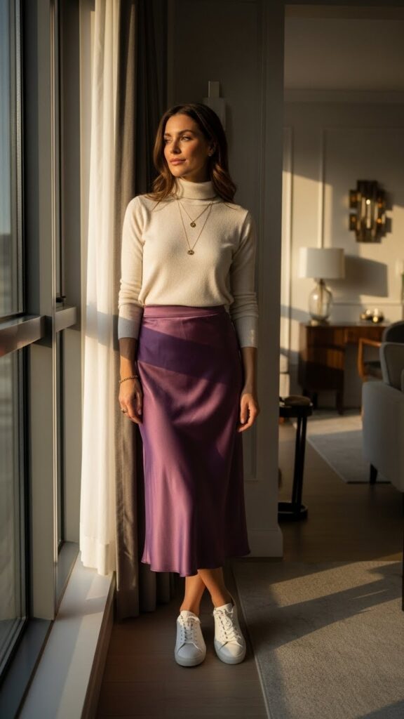 This look is the perfect blend of soft and sensual. A fitted, fine-knit sweater (a turtleneck or a simple crewneck) feels cozy and intimate. Tuck it into a flowy, midi satin skirt in a jewel tone.