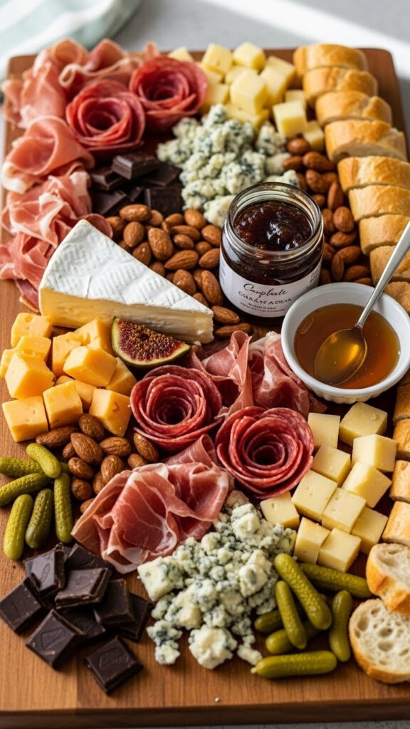 - Accompaniments: Marcona almonds, dark chocolate, fig jam, honey, cornichons, olives.