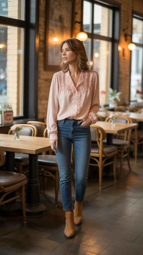 Think: delicate lace, a ruffled neckline, puff sleeves, or a top with beautiful sheer panels. Tuck it in. Now, the shoe choice dictates the vibe: ankle boots keep it modern and grounded, while strappy sandals or pointed-toe pumps dress it up instantly. It’s approachable, stylish, and 100% you.