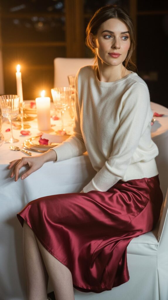 Now, anchor it with something relaxed on top: a fitted, cashmere crewneck or a simple bodysuit. Tuck it in. The mix of luxe skirt and cozy knit is chef’s kiss. Finish with delicate jewelry and sleek heels. You’ll feel incredibly special, but the sweater keeps you from feeling overdressed or costume-y. It’s a perfect Valentine’s Day dinner look.