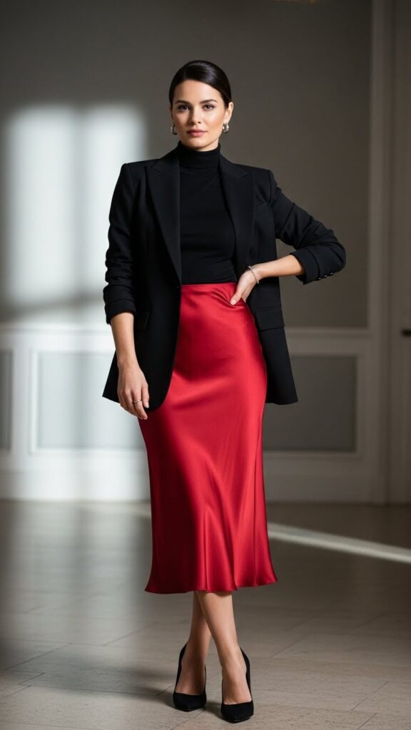 This combo is for the woman who wants to feel both polished and fashion-forward. Pair a sharp, tailored blazer (in a tuxedo black or a deep jewel tone) with a luxurious silk midi skirt. The skirt should have movement—a bias cut or a slight pleat.